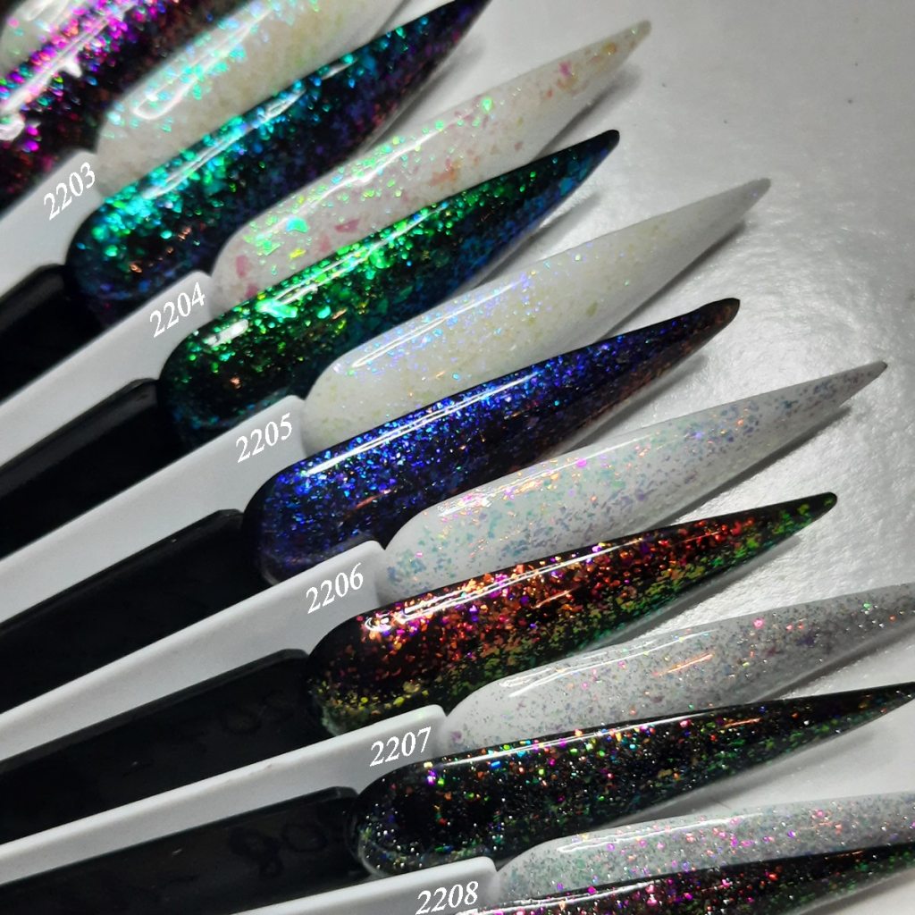 Effekt Gel mit Aurora Flakes gibt jeder Farbe eine besondere Note. Auf dem Bild sehen Sie Peacock Gel auf einem schwarzen Untergrund